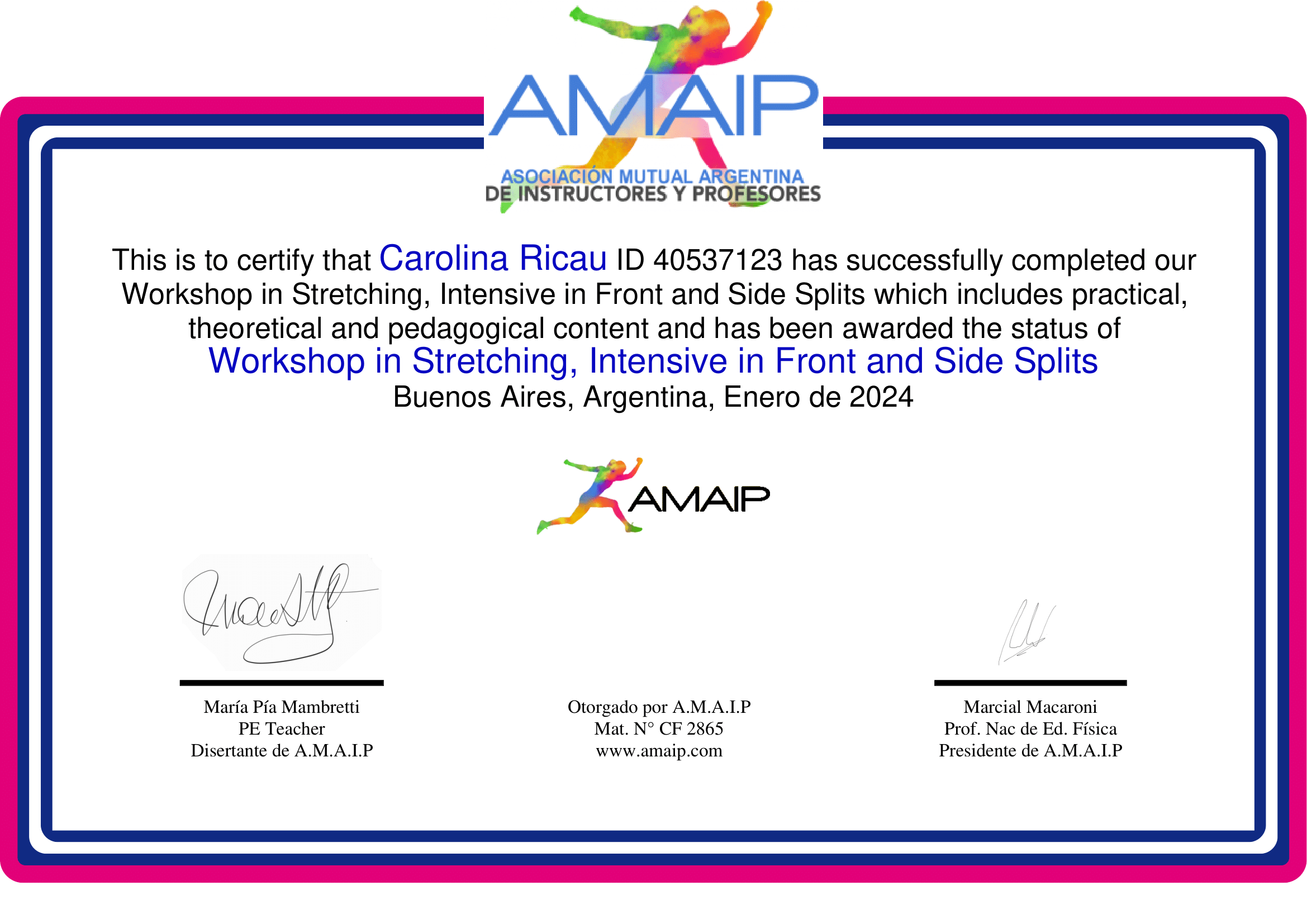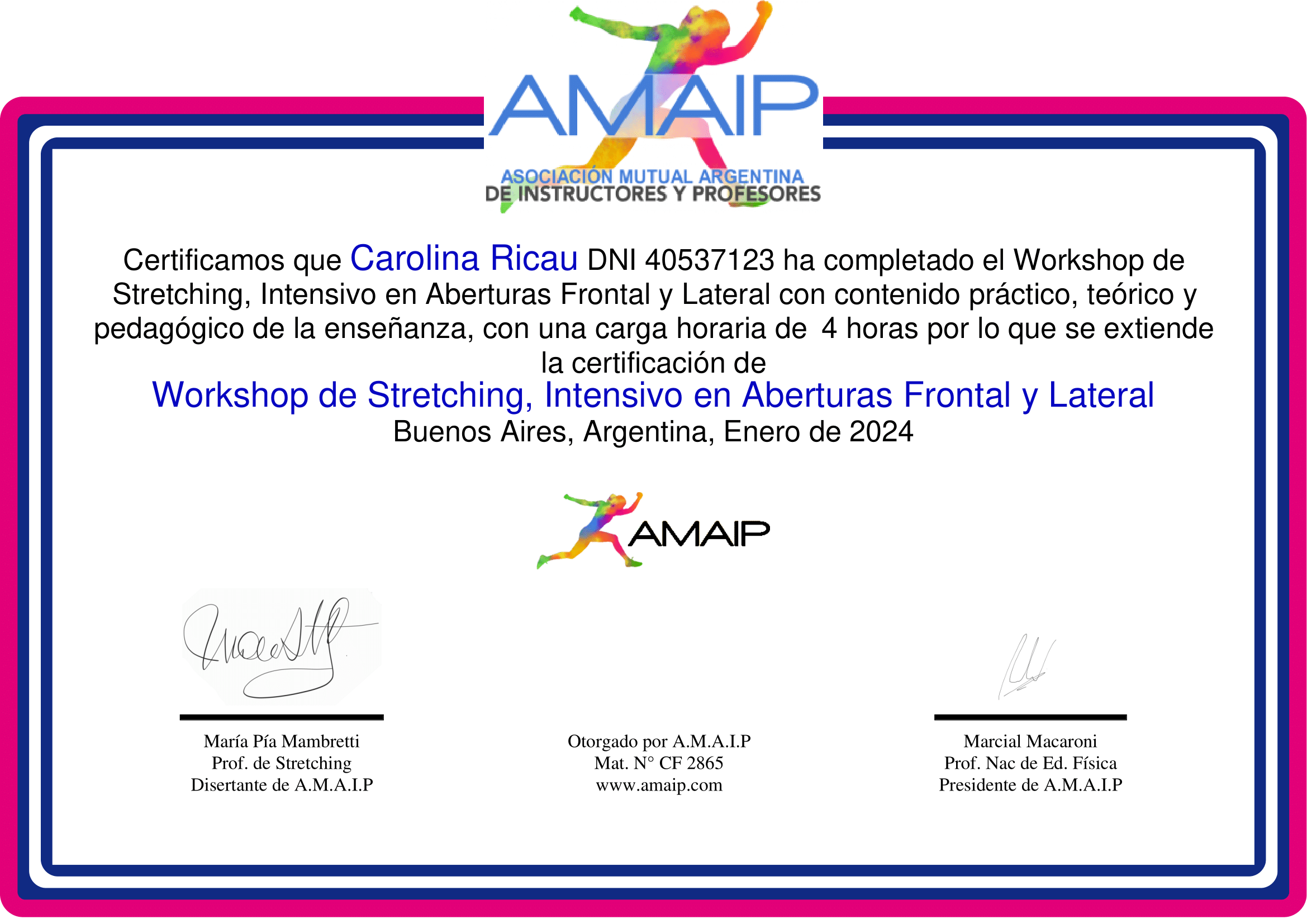 • Te damos la bienvenida a nuestro Workshop de Stretching. Una formación mega-intensiva, especializada en trabajar, mejorar e intensificar la flexibilidad para la abertura frontal y lateral. • Con 2hs de duración, y un formato 100% práctico. • Este tipo de capacitaciones, cuentan con un beneficio exclusivo: obteniendo tu carnet digital del socio AMAIP, podrás inscribirte con un 50% de descuento. Una oportunidad imperdible. • En este sitio verás toda la información del workshop, y el VIDEO explicativo sobre la modalidad de cursada. • Te esperamos en una experiencia única de formación, con cupos limitados. Bienvenidos a AMAIP!