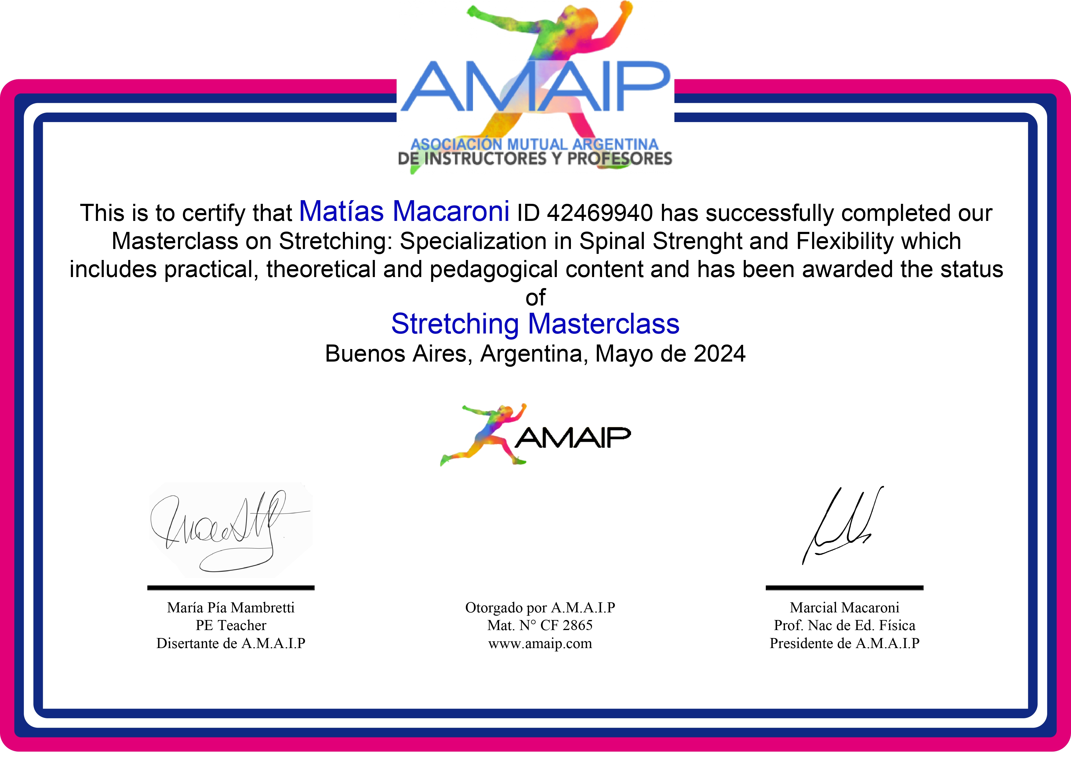 • Una de las claves para alcanzar un gran rendimiento deportivo, sin lesiones, o una excelente calidad de vida, es contar con una COLUMNA SALUDABLE, FUERTE Y FLEXIBLE. En esta masterclass online de 90 minutos, encontrarás cientos de ejercicios específicos de columna vertebral, para trabajar con deportistas, alumnos en un gimnasio, adultos mayores, y en cada nivel de entrenamiento (inicial - intermedio - avanzado). • IMPORTANTE: estas formaciones, cuentan con un beneficio exclusivo: obteniendo tu carnet digital del socio AMAIP, podrás inscribirte con un 50% de DESCUENTO. • Te invitamos a ver toda la información de la masterclass en este sitio, y a formar parte de esta increíble cursada!