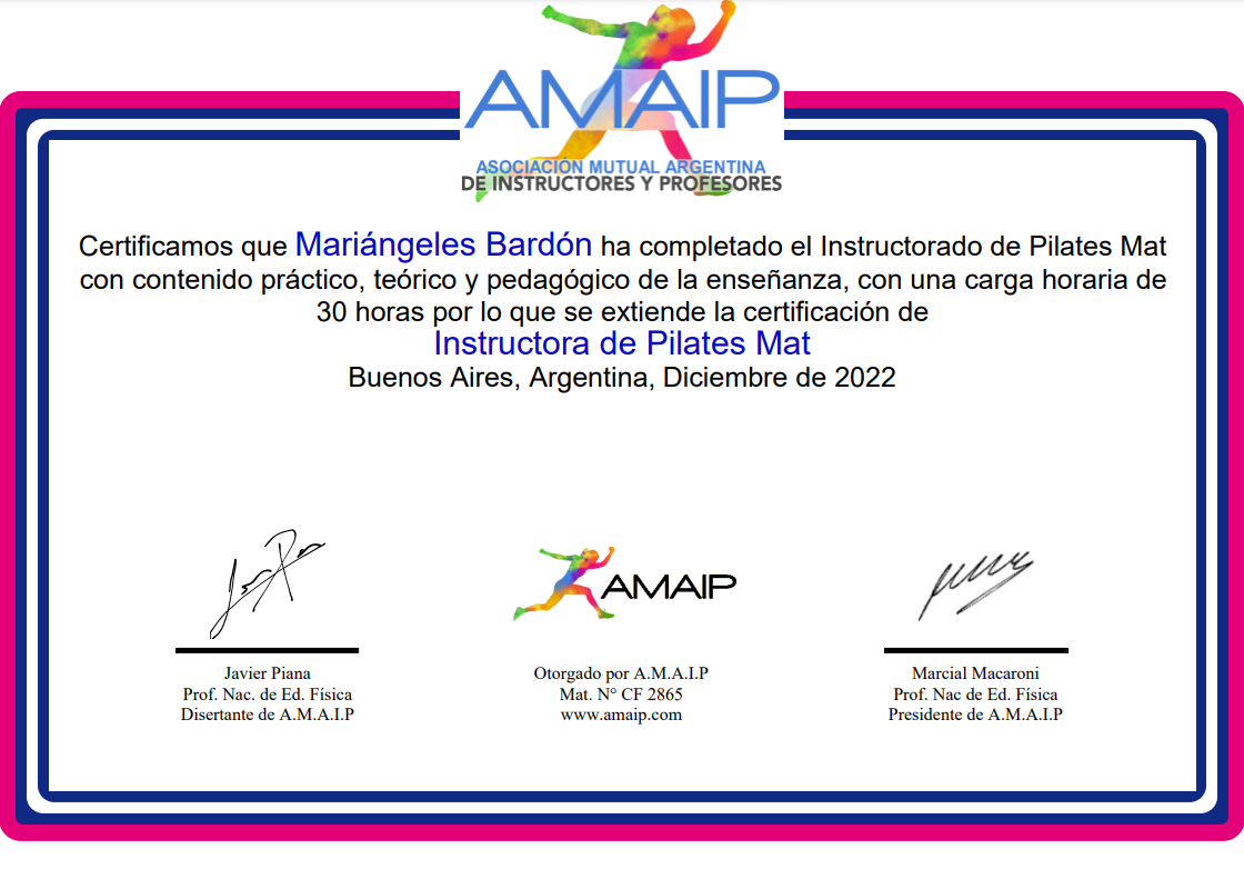 • El instructorado más solicitado por nuestros alumnos: con contenido exclusivo en Pilates Mat. Con la posibilidad de dedicar todo el material al método Pilates Mat (colchoneta), se encontrarán con nuevas variantes, ejercicios, elementos, principios, y métodos de planificación para esta modalidad, como nunca antes. • Dictado por el Instructor Javier Piana, especialista en el método Pilates y socio fundador de AMAIP, con trayectoria de más de 20 años como Instructor del Método. • Te invito a ver el siguiente VIDEO EXPLICATIVO, donde podrás ver todos los detalles acerca del Instructorado, y luego seguir leyendo el temario. • Cualquier consulta estamos a disposición, bienvenidos a AMAIP.