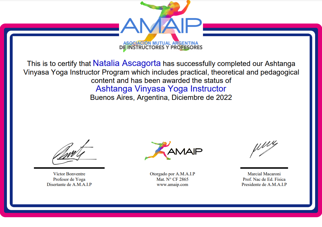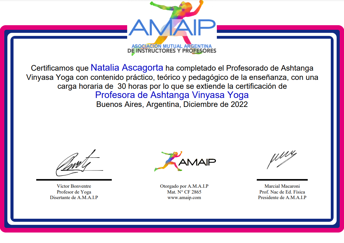 • La dinámica de éste estilo ha atraído hasta la actualidad, a deportistas, entrenadores, y personas que se sienten motivadas por una práctica física intensa coordinada con la respiración, donde cada practicante irá avanzando a su propio ritmo con la Sadhana (práctica sostenida), sin forzar. • En este profesorado veremos la Primera serie de Ashtanga Vinyasa Yoga, la más popular aprendida en Occidente, y una excelente forma de entrenar la fuerza, la flexibilidad, y el equilibrio, físico y psíquico-emocional mediante técnicas de concentración en el aquí y ahora. (Pranayama Ujjayi – Bhandas “llaves energéticas” – Drishtis “mirada enfocada”). • Te invito a ver el Siguiente VIDEO EXPLICATIVO, donde podrás observar todos los detalles acerca del Profesorado, y luego seguir leyendo el temario. • Cualquier consulta estamos a disposición, bienvenidos a AMAIP.