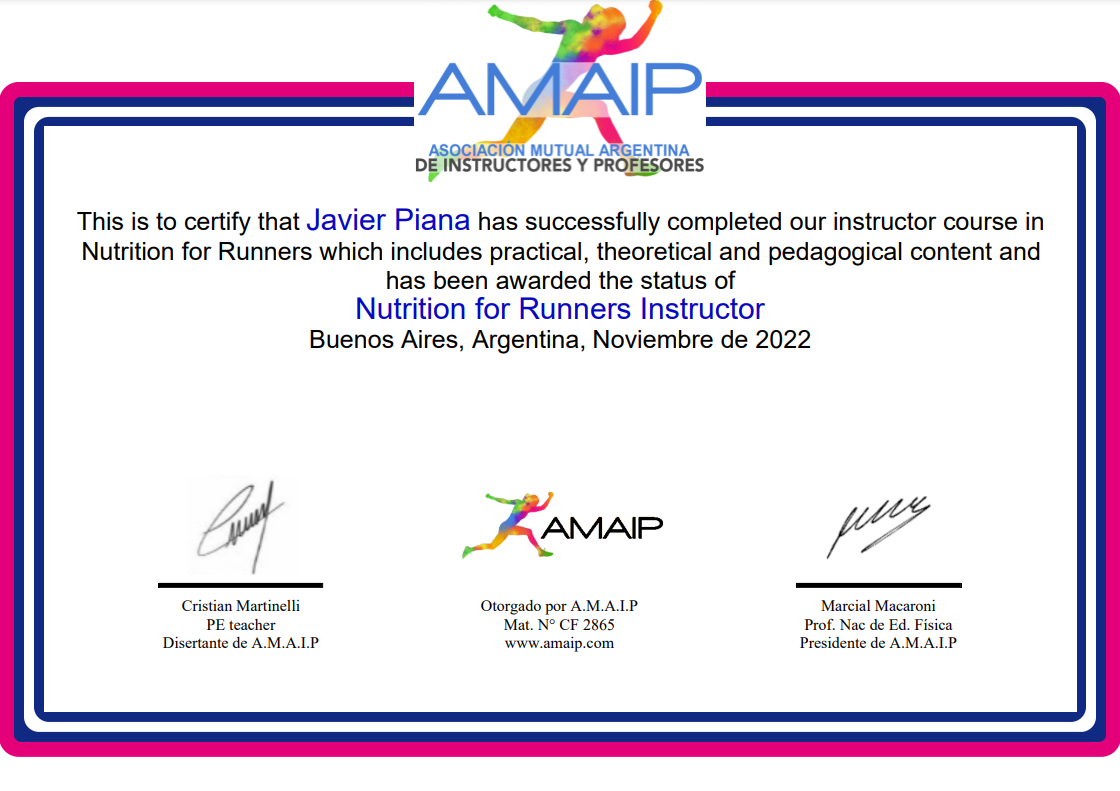 • Dos capacitaciones en una. • El profesorado definitivo para la preparación física y técnica de cara a competiciones de 10, 21 y 42 km, y para la organización de grupos Running Team. • Con las herramientas necesarias para diseñar un plan de alimentación integral, con todos los requerimientos alimenticios durante el período de preparación; las semanas previas a la competencia; durante la carrera, y posterior a la misma. • Dictado por el profesor Cristian Martinelli, con más de 15 años al frente de grupos de Running, y como atleta de competición. • Te invito a ver el siguiente VIDEO EXPLICATIVO, donde podrás observar todos los detalles acerca del instructorado, y luego seguir leyendo el temario. • Cualquier consulta estamos a disposición, bienvenidos a AMAIP.