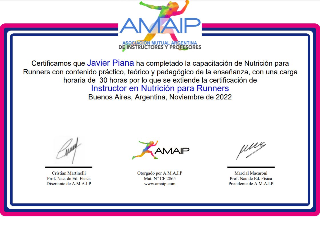 • La formación ideal para diseñar un plan de alimentación integral, y potenciar al máximo el rendimiento deportivo en competiciones de running. • En 5 módulos INTENSIVOS, verás todos los requerimientos alimenticios durante el período de preparación; las semanas previas a la competencia; durante la carrera, y posterior a la misma. • Al finalizar la cursada, serás capaz de reconocer los requerimientos de macronutrientes, vitaminas y minerales, la hidratación, y la suplementación adecuada según el objetivo del atleta (fondistas, carrera de aventura, recreativo, etc.). • Dictado por el profesor Cristian Martinelli, con más de 15 años al frente de grupos de Running, y como atleta de competición. • En el siguiente VIDEO EXPLICATIVO, donde podrás ver todos los detalles acerca del Instructorado, y luego seguir leyendo el temario. • Cualquier consulta estamos a disposición, bienvenidos a AMAIP.