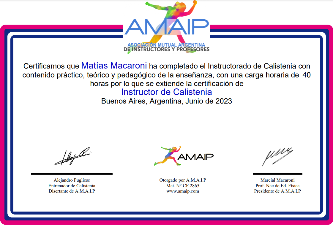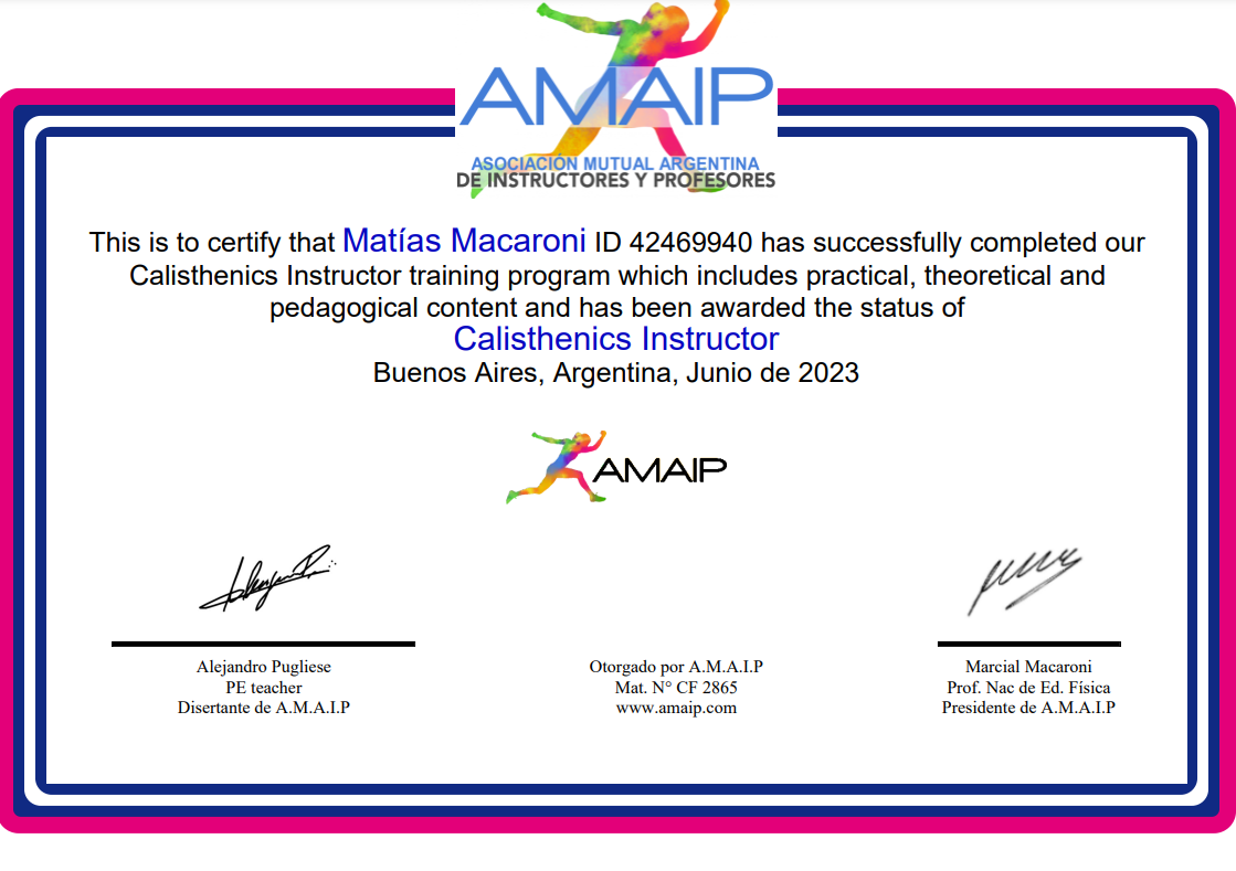 • Te damos la bienvenida al Instructorado de Calistenia de AMAIP. • En esta formación, serás capaz de analizar cada patrón de movimiento, y las progresiones en dificultad de cada ejercicio, desde la BIOMECÁNICA. Profesionalizando al 100% tu labor como entrenador, potenciando tus clases al siguiente nivel • Dictado por el profesor Alejandro Pugliese, entrenador de calistenia por la federación española de Street Workout. • En este sitio, encontrarás el VIDEO EXPLICATIVO con todos los detalles de la cursada, el TEMARIO, el aval de las certificaciones oficiales, y contarás con el asesoramiento de nuestro equipo en todo momento. • ¡Bienvenidos a AMAIP!