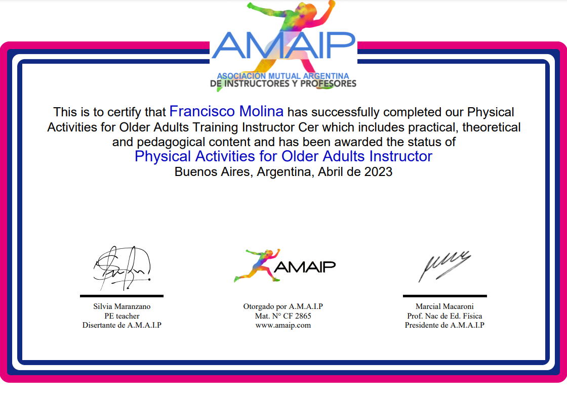 • Te damos la bienvenida al instructorado definitivo para desempeñarte como profesional, con grupos de personas mayores. • Al finalizar la formación, contarás con la capacidad de planificar tus clases, o tus programas de entrenamiento, comprendiendo las principales características desde el aspecto biológico y psicosocial en estas edades. • Son aspectos fundamentales para garantizar la salud y el bienestar de tus alumnos, y para que puedas seleccionar las mejores actividades de acuerdo a las necesidades del grupo. • Dictado por Mg. Silvia Maranzano, presidente de RAFAM Argentina, la red de actividad física para personas mayores más grande del país, organizando eventos y congresos a nivel internacional. • Te invitamos a ver el siguiente VIDEO EXPLICATIVO, donde podrás ver todos los detalles acerca del Instructorado, y luego seguir leyendo el temario. • Cualquier consulta estamos a disposición, bienvenidos a AMAIP.